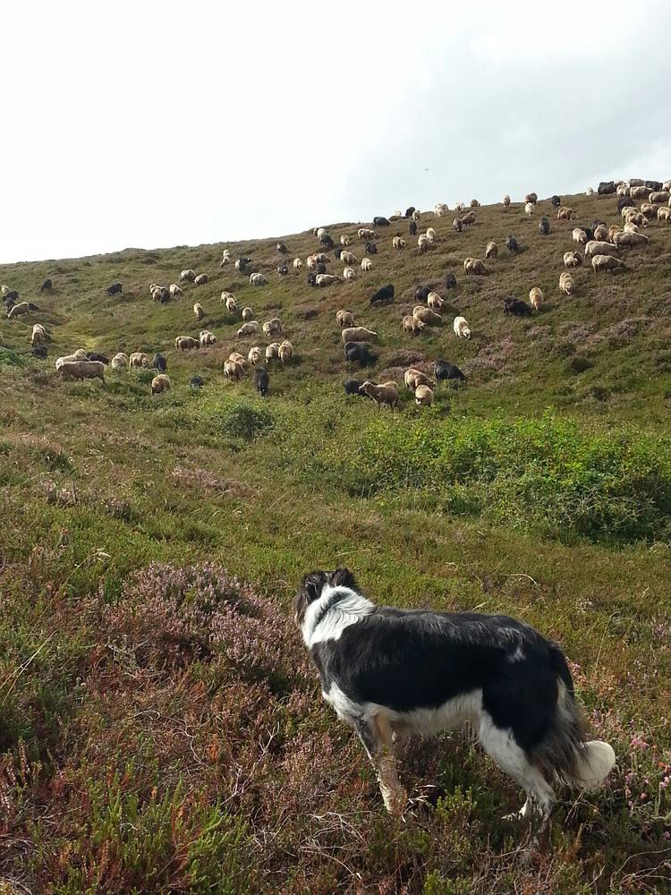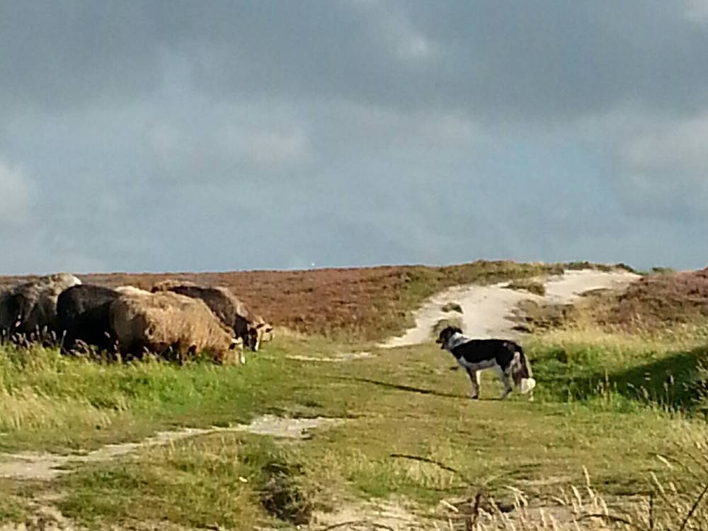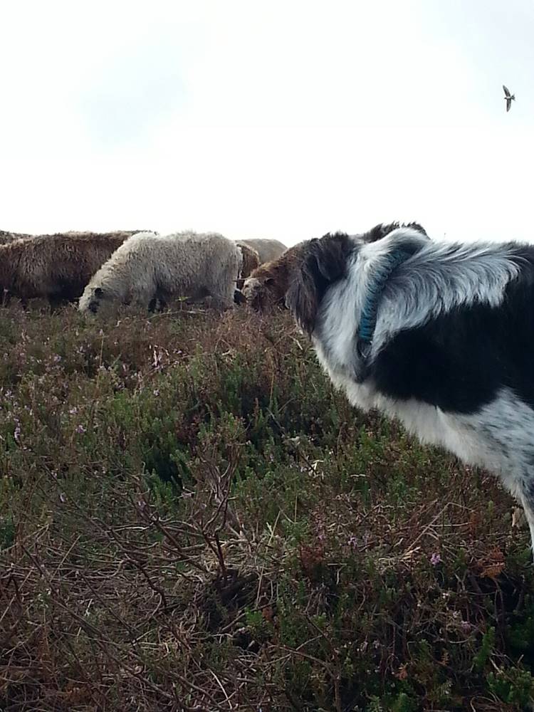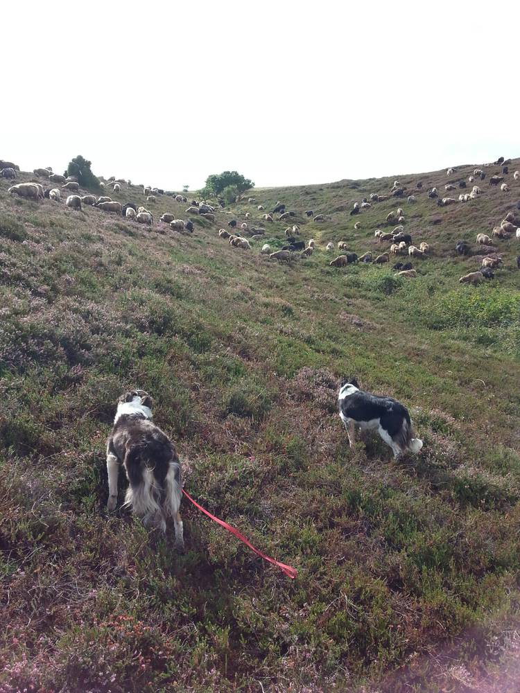 Ausgerüstet mit einem Rucksack mit diversen Notfall-Klamotten, einer Flasche Wasser und dem Handy fahre ich zur Herde. Die Damen schauen irritiert, aber hungrig. Kerry und Moon sollen mir helfen. Voller Respekt öffne ich den Pferch und versuche den Lockruf. Fehlanzeige! ok… nochmal…. "Komma Schoppii" - "Kooommmaaaaaaaa" . Irritiert schauen zwei Border Collies mich an, aber siehe da… die Herde setzt sich in Bewegung. Sie folgen mir, sie folgen mir in die Heide. Ein ergreifendes Gefühl wächst in mir. Ich schicke Kerry, sie läuft erstaunlich weit und seeeehr geschmeidig. It works!!!!! Es klappt tatsächlich, genauso wie am Morgen. Nun beginne ich damit, meine Arbeit zu genießen. Die Herde weidet ruhig, und die Border Collies lernen, sich sinnig und konstruktiv zu bewegen. Die Heide ist durchzogen mit Wanderwegen, und diese sind frequentiert von vielen Wanderern, Joggern und Reitern. Ich versuche Kerry und Moon so einzusetzen, dass die Herde auf mich zu fressen kann und keine Tiere auf den Wegen parken. Klappt super! Und schon ist man mit den ersten "Touries" im Gespräch. "Sind das Ihre Schafe? Wieviele sind das denn? Ach die Hunde machen das aber toll! Kommen Sie von der Insel? Sind das Border Collies? Die sind ja so klein!" usw. Ich gestehe, ich habe Spaß und unterhalte mich prächtig, dieweil die Herde sich den Wanst vollschlägt.